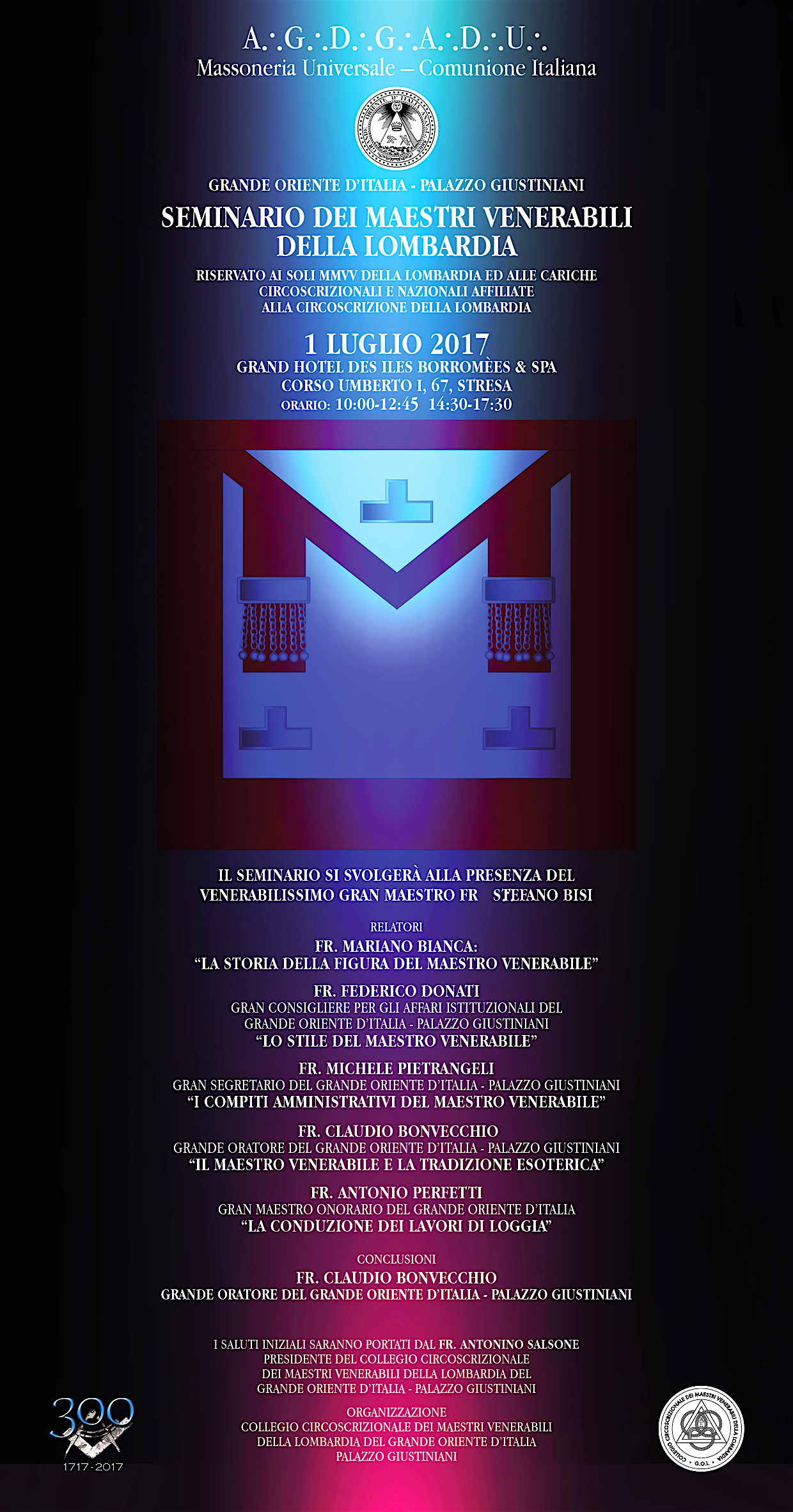 È in programma per sabato 1 luglio il Seminario dei Maestri Venerabili della Lombardia organizzato dal Collegio Circoscrizionale della regione. L’evento si svolgerà a Stresa, sul Lago Maggiore, presso il Grand Hotel Des Iles Borromèes (Corso Umberto I, 67), ed è riservato esclusivamente ai maestri venerabili delle logge lombarde (o a un loro delegato), agli Ispettori e Giudici Circoscrizionali, agli ex Presidenti del Collegio della Lombardia, e a esponenti del Grande Oriente d’Italia con ruoli nazionali – purché a piè di lista di logge della circoscrizione lombarda – quali i membri di commissione permanenti, i Consiglieri dell’Ordine, i Gran Rappresentanti, i Giudici di Corte Centrale, i Grandi Ufficiali di Gran Loggia, gli ex Membri di Giunta, i Membri di Giunta. Il Gran Maestro Stefano Bisi parteciperà ai lavori.