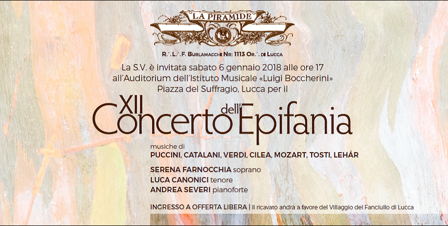 Concerto dell’ Epifania il 6 gennaio all’Istituto Musicale Boccherini di Lucca. A riprendere una tradizione che tanto interesse ha suscitato nelle precedenti edizioni è stata la Loggia Francesco Burlamacchi n° 1113 di Lucca. In occasione dell’evento verrà fatta una donazione alla Fondazione Villaggio del Fanciullo della città toscana, che assiste i bambini abbandonati, orfani e figli di famiglie in difficoltà.