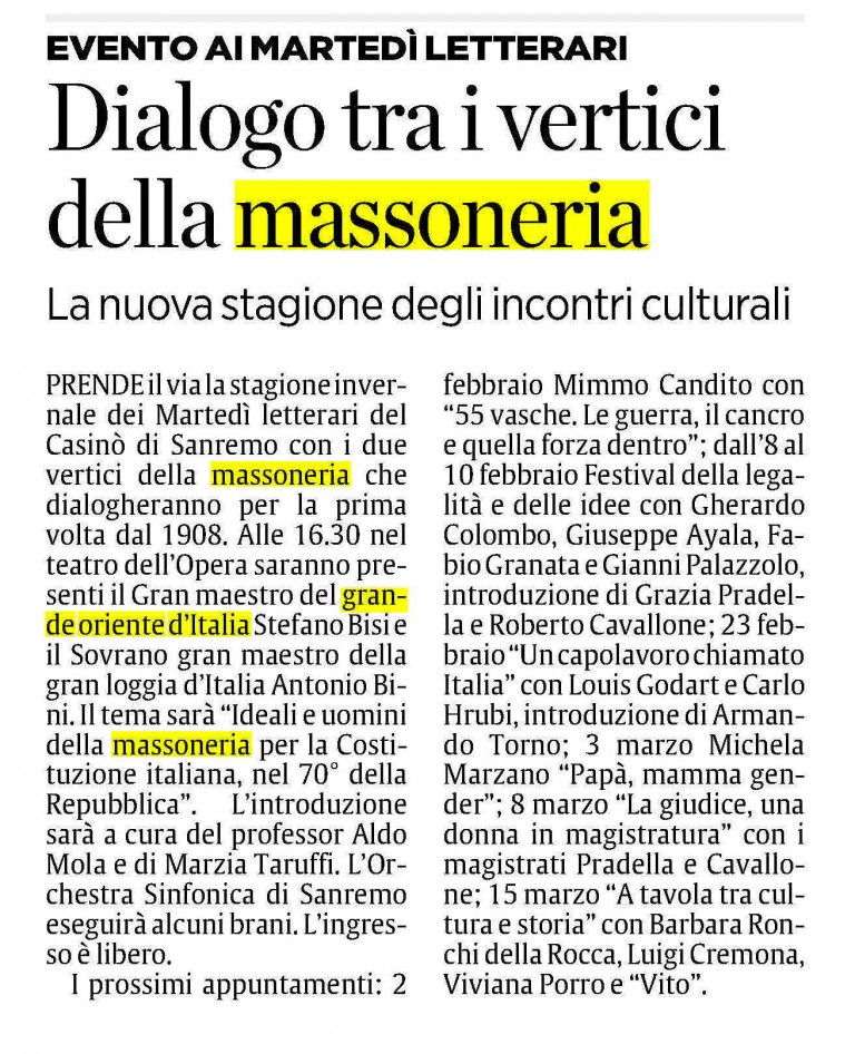 I vertici della massoneria nazionale hanno aperto ieri la stagione dei «Martedì Letterari» del casinò di Sanremo. Il teatro dell’opera esaurito in ogni ordine di posti ha segnato l’interesse del pubblico, e di decine di massoni delle due obbedienze, per i temi trattati durante la conferenza. A prendere la parola sono stati Antonio Binni, Gran Maestro della Gran Loggia d`Italia, e i Stefano Bisi, Gran Maestro del Grande Oriente d`Italia.