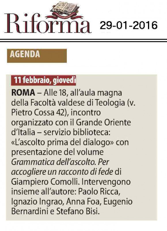 Grammatica dell’ascolto, incontro a Roma nella Facoltà valdese di teologia. Partecipa il Gran Maestro Bisi / Riforma